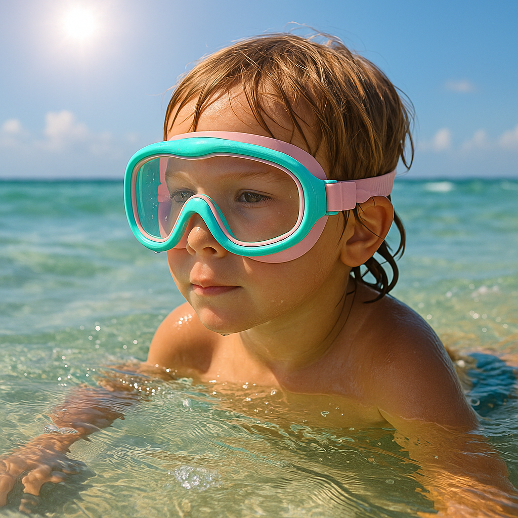 Discovering the underwater world is a crystal-clear experience through our extra-wide PC lenses. These are not just ordinary lenses; they offer a 180° panoramic field of vision, guaranteeing that your child can observe all marine life without any fogging. Additionally, they protect delicate eyes from harmful UV rays, allowing your kids to enjoy swimming safely in the sun.