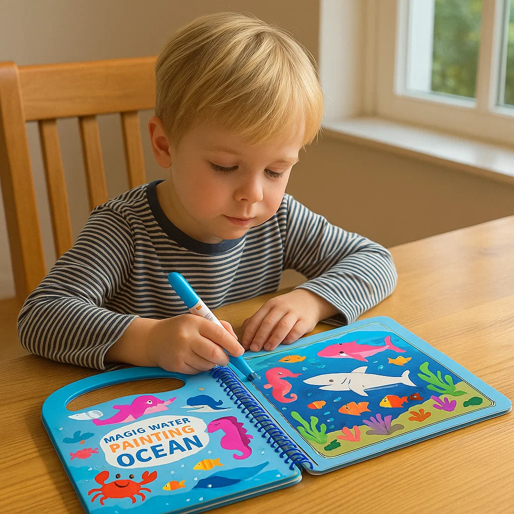 Aquillo is designed using premium, toddler-safe materials, guaranteeing safety, longevity, and suitability for smaller hands. The robust, pliable pages are intended to endure the lively strokes of emerging artists, enabling limitless reusability. Once the pages dry, they revert to their pristine form, poised to inspire your child's latest creative expressions.