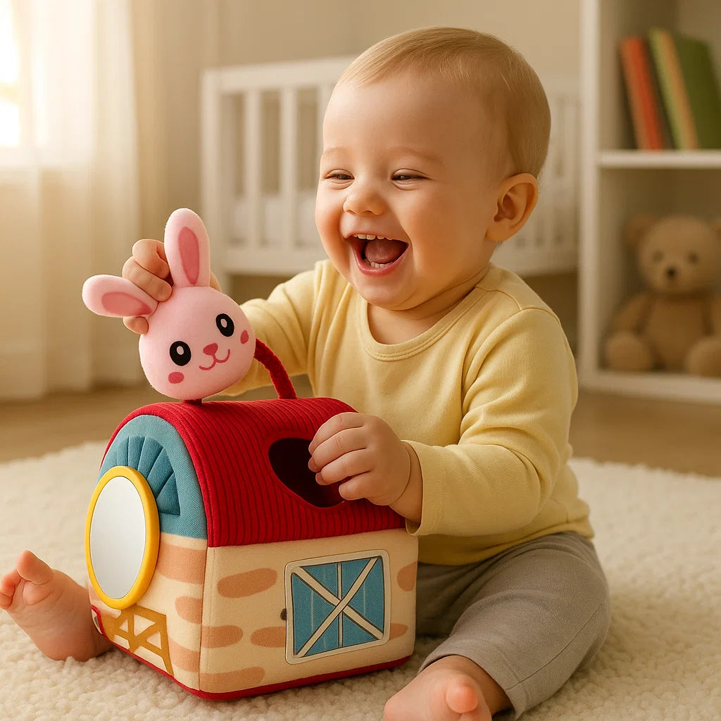 This toy offers more than just charm. Each creature slots into a unique opening, supporting shape identification and hand-eye coordination. The barn can be zipped, opened, and folded effortlessly, allowing your child to discover cause and effect while engaging at their own rhythm. A baby-safe mirror is also included to encourage self-recognition and joyful expressions.