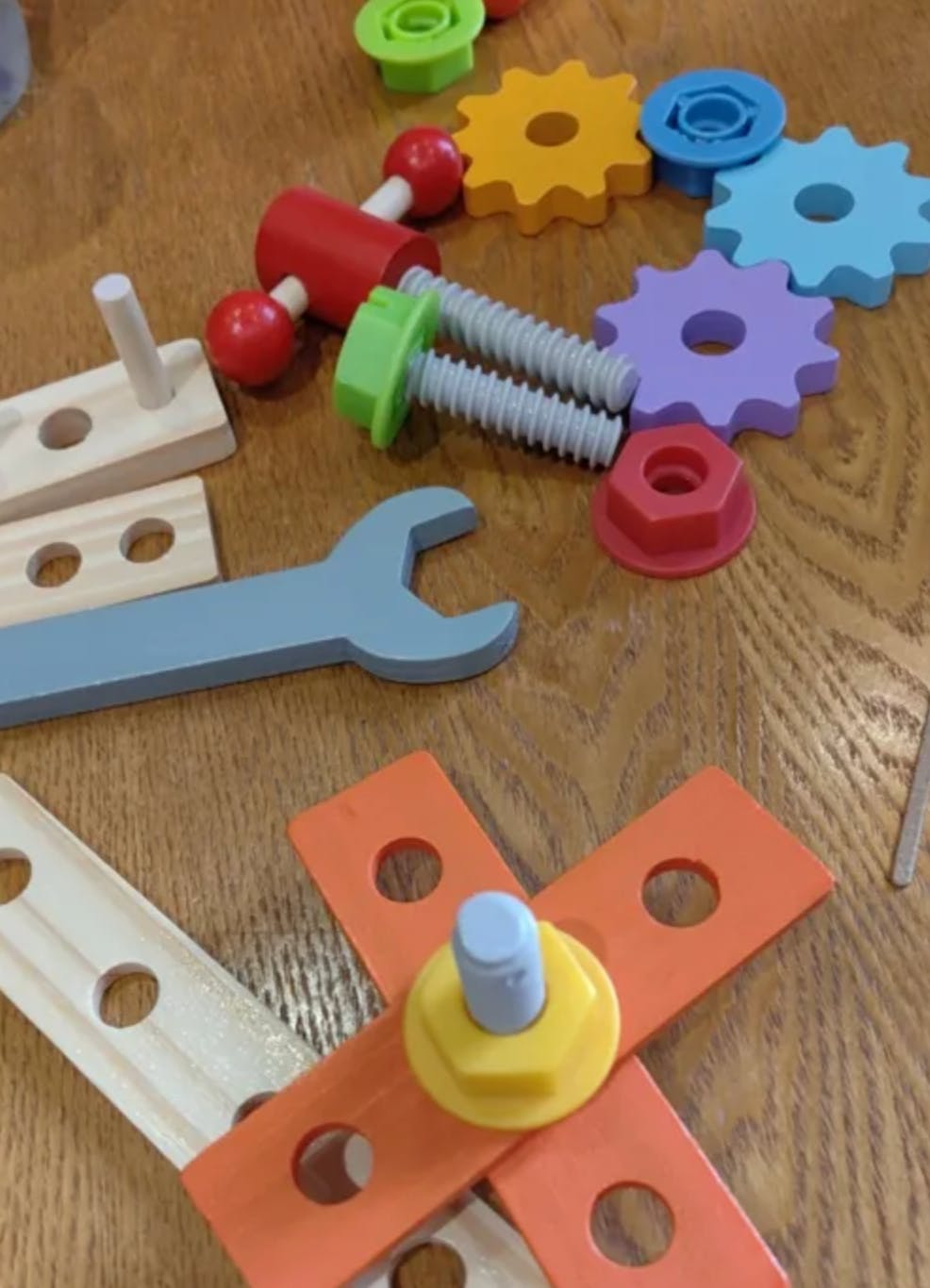my toddler is obsessed with this thing lol, he calls it his “work kit” and carries it everywhere. the pieces are chunky enough for his little hands and he loves pretending to fix stuff around the house. only thing is the screws loosen kinda easy but not a huge deal