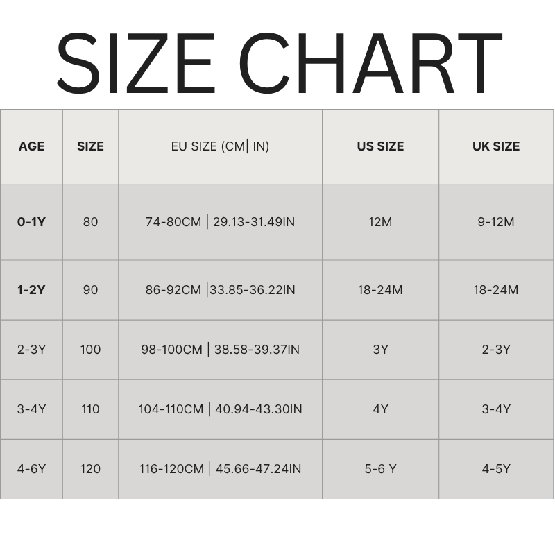 - Available Size: 80 (6-12M), 90 (18-24M), 100 (3Y), 110 (4Y), 120 (5Y)