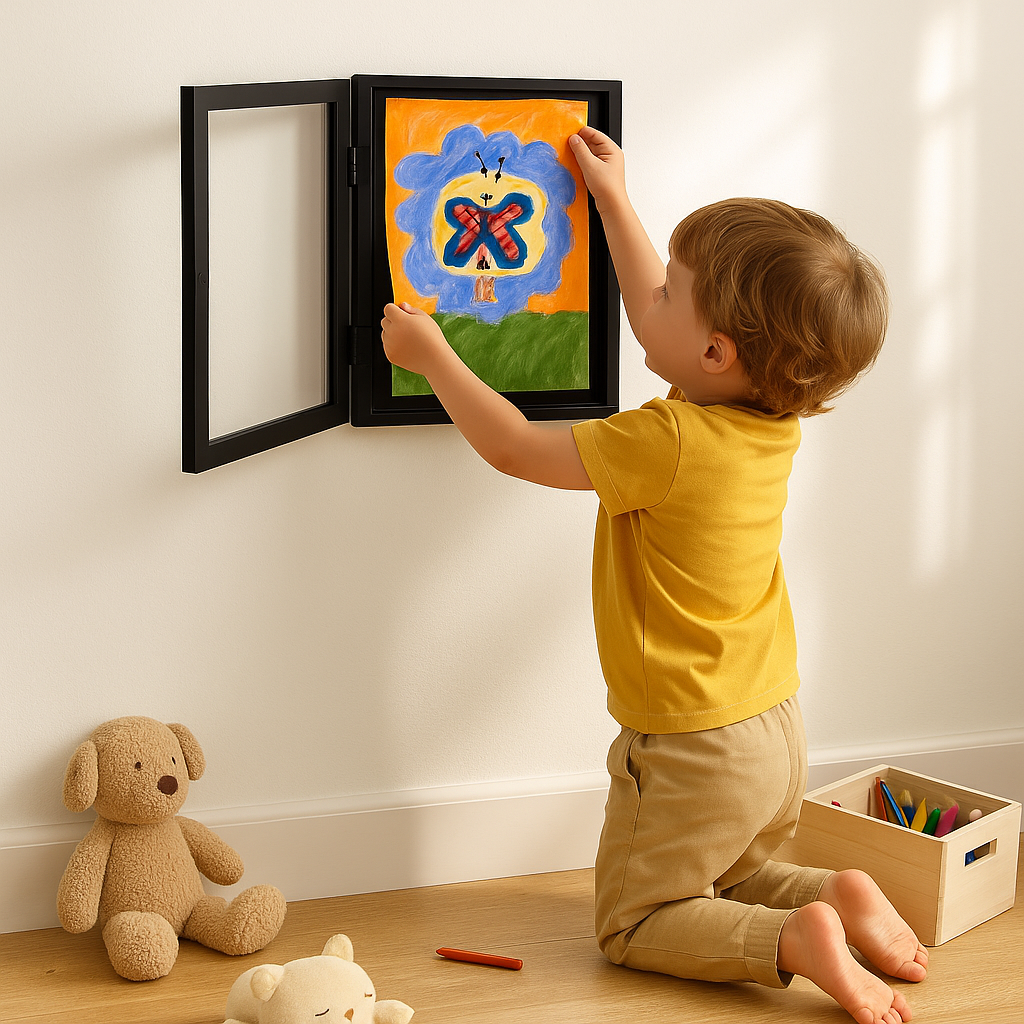 Made with the highest quality materials, the Draw & Store - Kid's Picture Frame is built to last. The sturdy frame holds up to everyday wear and tear, and the door is secured with a powerful magnet, ensuring your child's artwork is kept safe and sound.