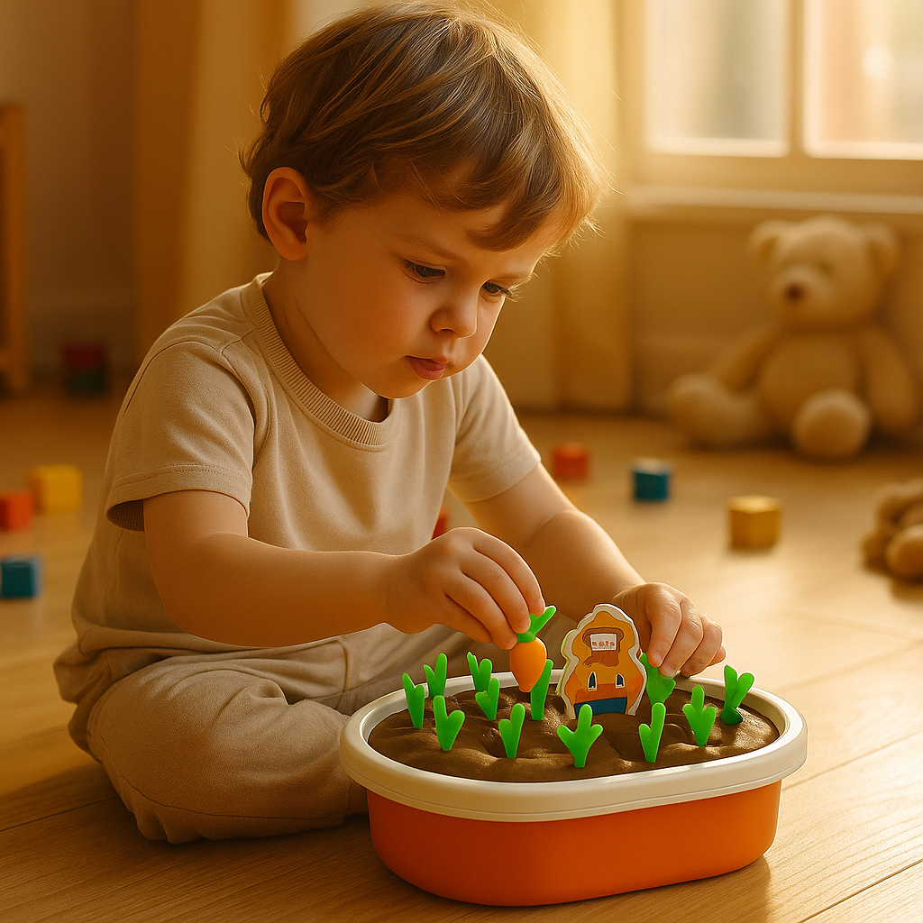 Harvesto also improves hand-eye coordination and fine motor skills. The act of grabbing, pulling, and placing each carrot helps develop precision and control. It’s a simple yet powerful way to support early development while keeping little hands busy.