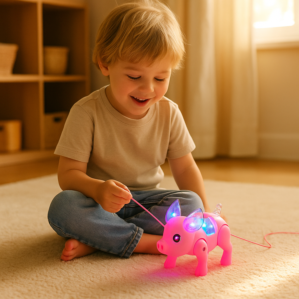 It's not merely adorable—it's energetic as well. When your child grips the leash and strolls with their new pal, they’ll relish a lively blend of movement, sounds, and lights. The pig glides effortlessly, illuminating its path as it moves, with upbeat tunes fueling the excitement. It's a spirited companion that brings an extra dose of enjoyment to both indoor and outdoor fun.