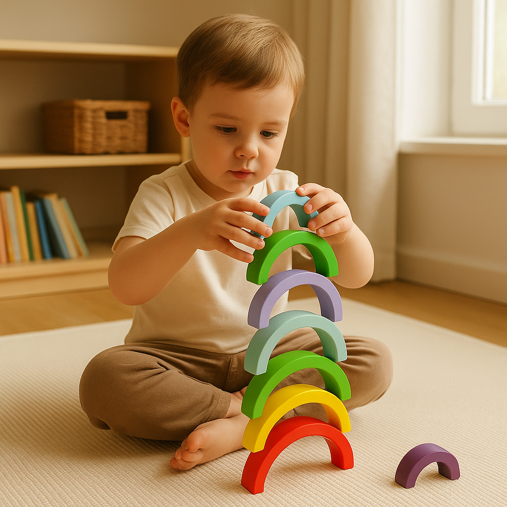 Each curve and angle of these vibrant arches opens up a universe of imaginative play. This goes beyond mere stacking; it involves weaving tales, creating whimsical rainbow villages, or even constructing quirky bridges for toy vehicles. Plus, while engaging in fun, they're simultaneously refining their fine motor abilities and discovering colors and balance.