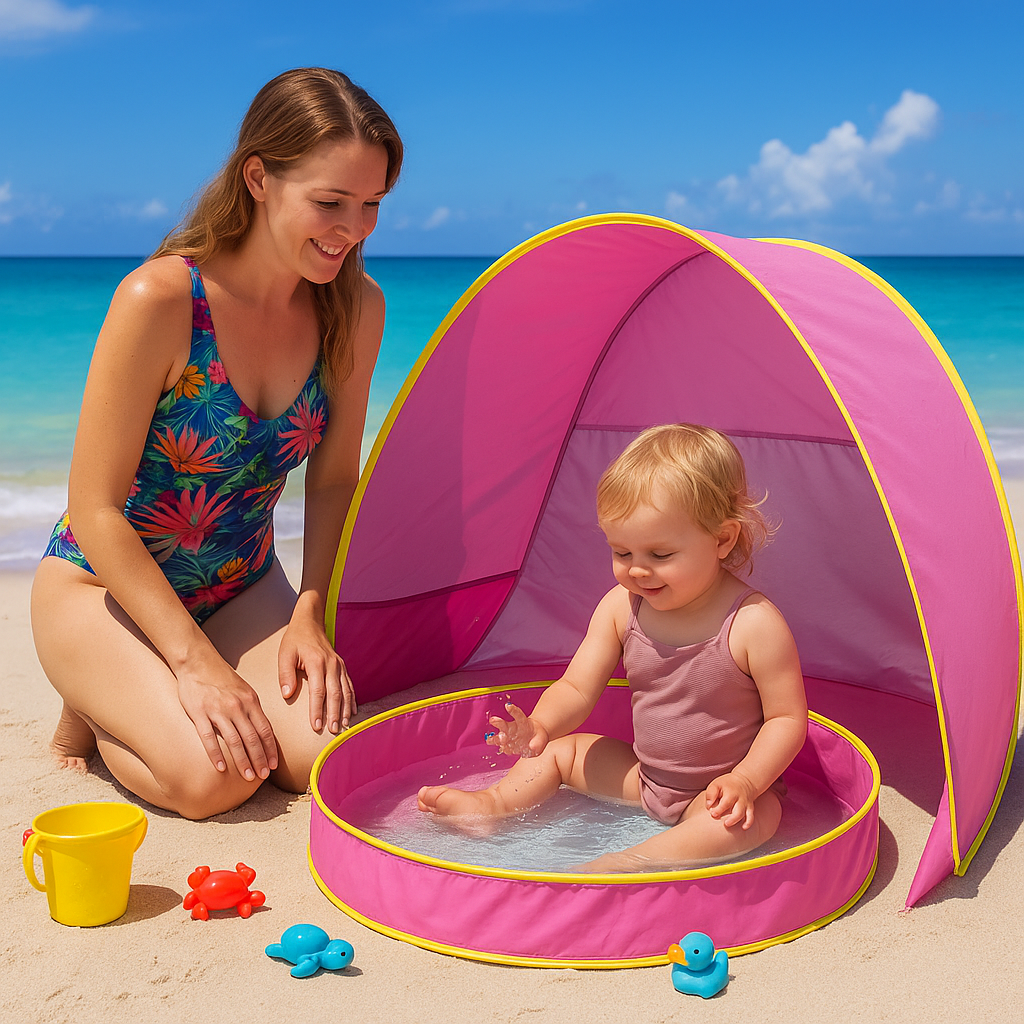 This unique pool-in-tent design offers endless entertainment, combining the joy of water play with the comfort of a shaded retreat – all in one delightful package that's perfect for beachside fun with your cherished newborns and toddlers.