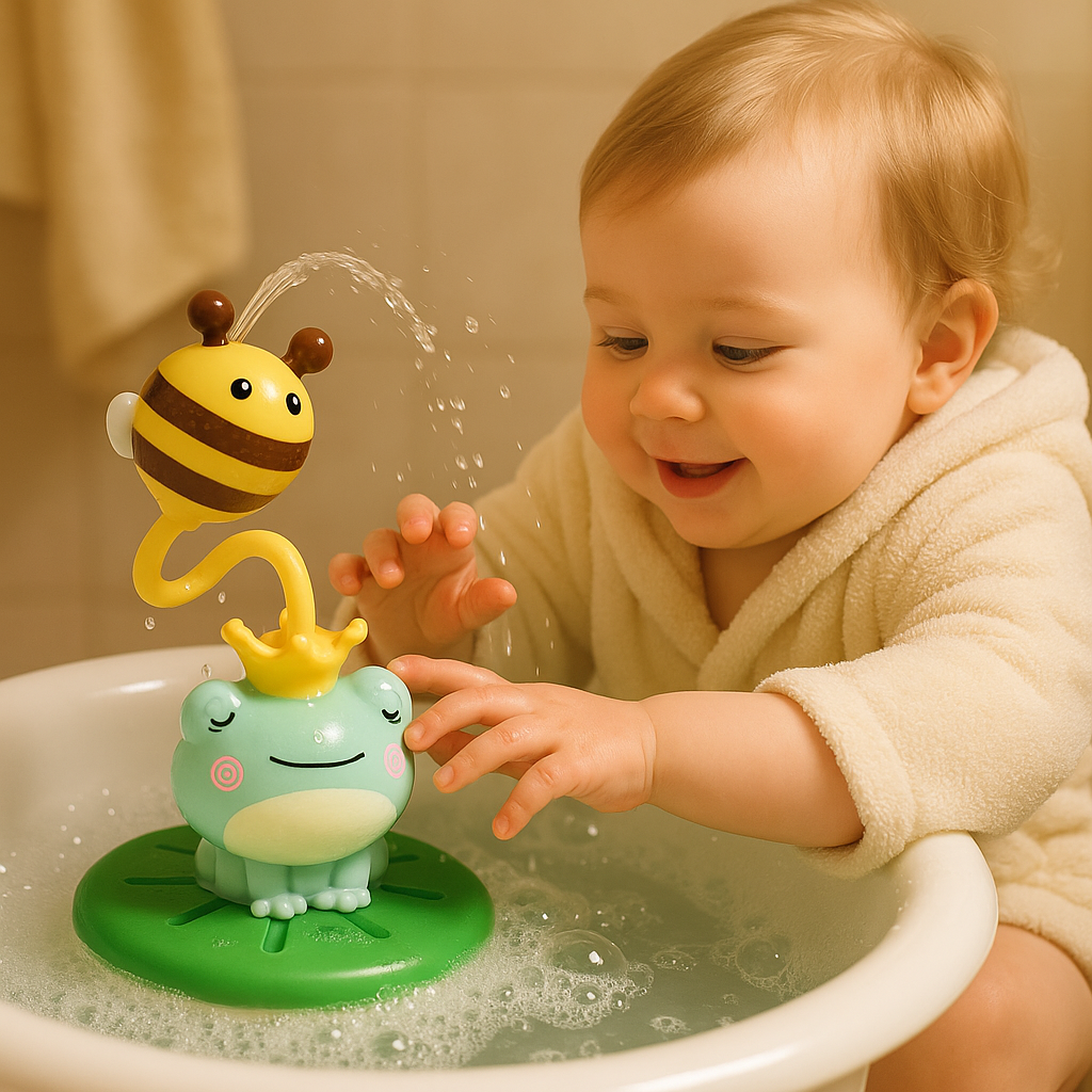 Transform your bathing experience into an enchanting aquatic realm with Sprizzle—a whimsical frog sprinkler that twirls, sprays, and provides joy with its lively attachments, including a dancing bee and ceaseless splashes, turning every bath into a joyful, illuminating experience.
