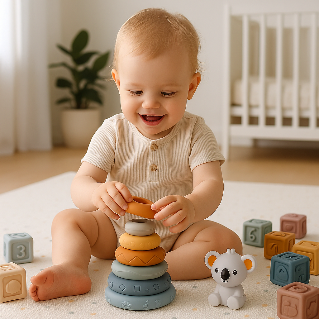 Soothe teething pain while keeping your baby entertained. The soft, chewable silicone rings and blocks are safe, non-toxic, and perfect for little hands and mouths. Whether it's a teething aid or a squishy squeeze toy, Stackito is there to keep your baby happy and calm.