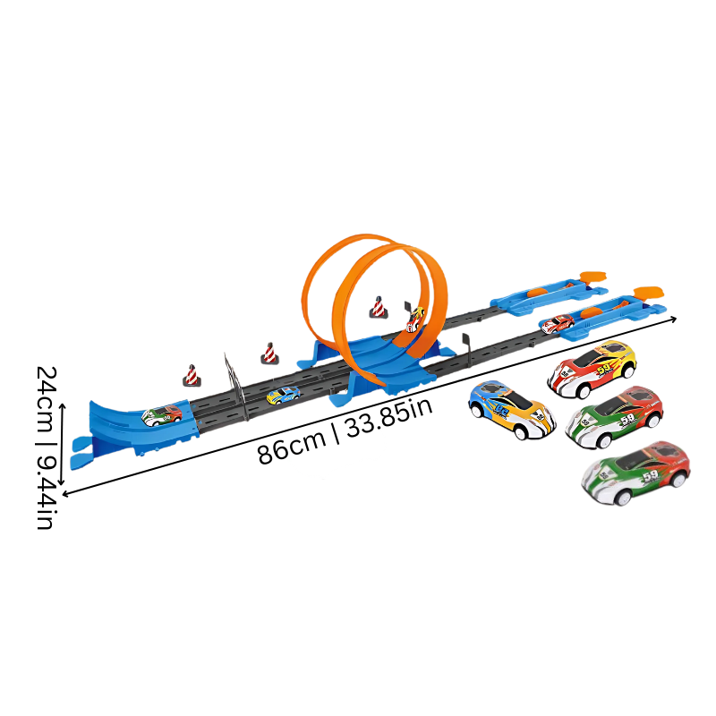 This racing set is way cooler than I expected for the price. The loops are smooth and the cars don’t get stuck unless the launch isn’t strong enough. Just make sure to click the pieces in firmly or the track might separate a bit.